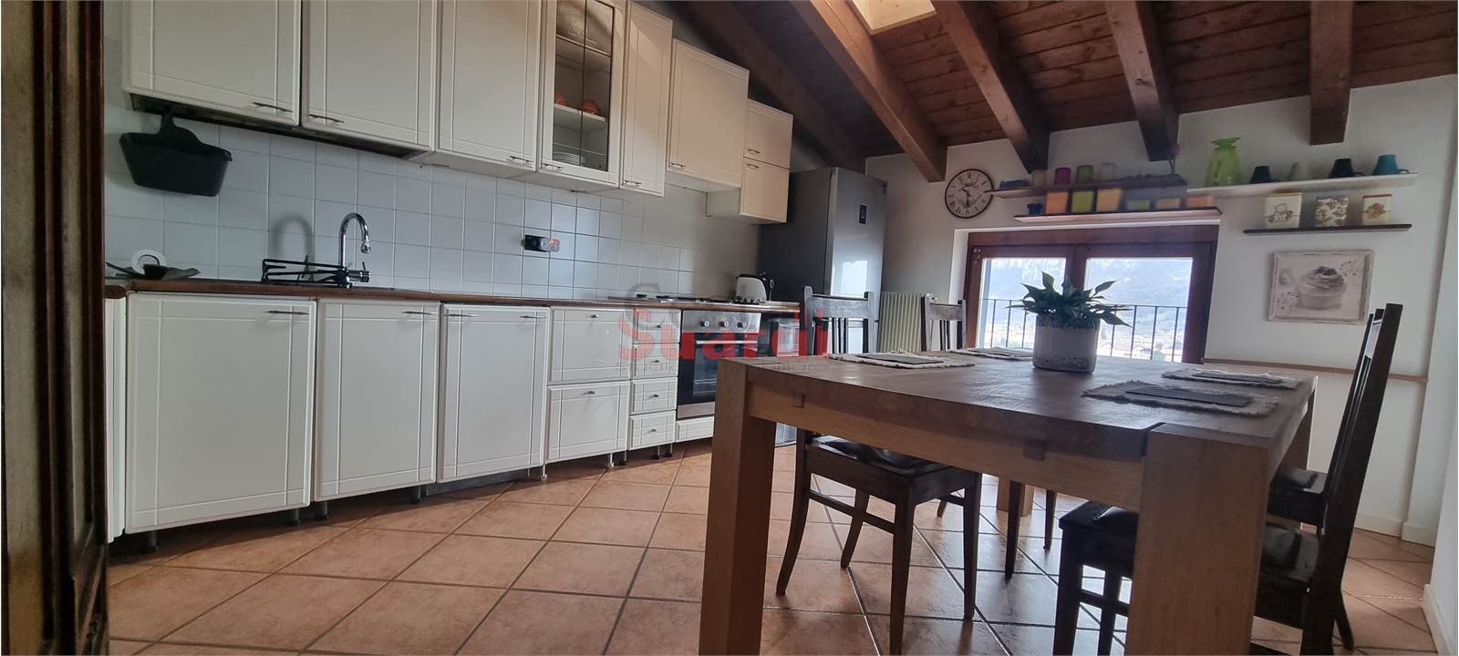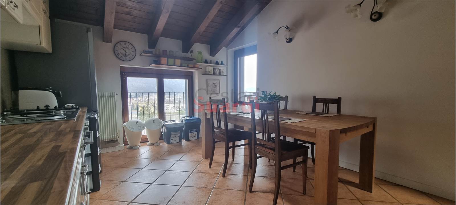 Sia il soggiorno che la cucina abitabile, ampia e luminosa, affacciano su un terrazzo vivibile: uno spazio da vivere ogni giorno, con vista aperta e dominante, perfetto per colazioni, pranzi o cene al tramonto.